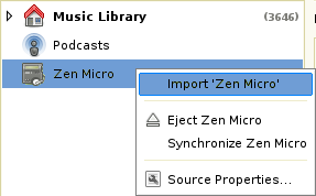 Banshee supports importing music from your digital audio player to your music library. Simply drag and drop the songs from your digital audio player to your Music Library and they are copied automatically. You can also import all of the music on your digital audio player by right- clicking your player in the source list and selecting .