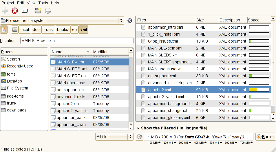 The project view appears. Drag and drop the desired directories or individual files either from your file manager or by clicking on . To show your directory structure directly in Brasero, select . Save the project under a name of your choice with . After you are finished, click .