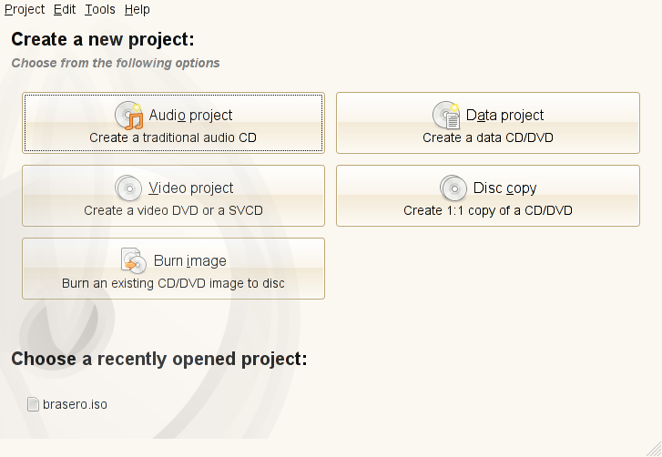 After starting Brasero for the first time, the main window appears as shown in Main View of Brasero. To create a CD or DVD, click on .