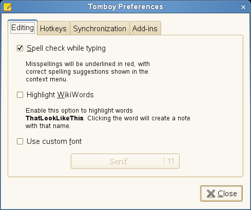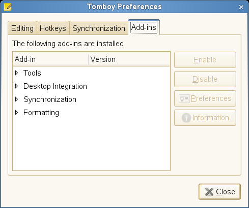 The Add-ins tabbed page lets you enable and configure Tomboy add-ins (formerly called plugins). Tomboy comes with several pre-installed add-ins, such as Backlinks, Bugzilla Links, Evolution Mail Integration, Export to HTML, Fixed Width, Note of the Day, Printing Support, and Sticky Notes Importer.