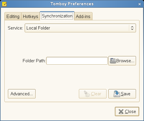 The Synchronization tabbed page lets you share notes, announce notes, receive announcements, and get notes from other instances of Tomboy. This can be useful, for example, if you want to work on a single set of notes in separate instances of Tomboy running on your desktop and your laptop.