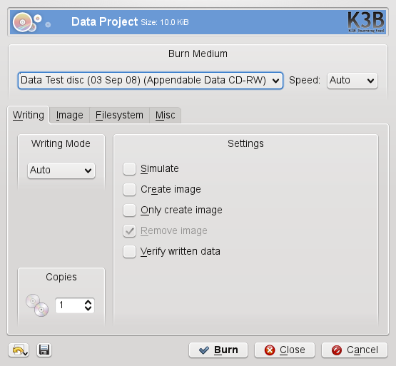This option determines how the laser writes the CD or DVD. For CDs, there are three modes available: DAO (disk at once), TAO (track at once), and RAW. In DAO mode, the laser is not deactivated while the disk is written. This mode is recommended for the creation of audio CDs. In the TAO mode, a separate write process is used for each individual track. The RAW mode is not used very often, because the writer does not perform any data corrections. For DVDs, there are two modes available: auto or DAO. It is recommended to select , because it allows K3b to use the most suitable settings. Do not use the DAO mode if you want to create multisession DVDs.