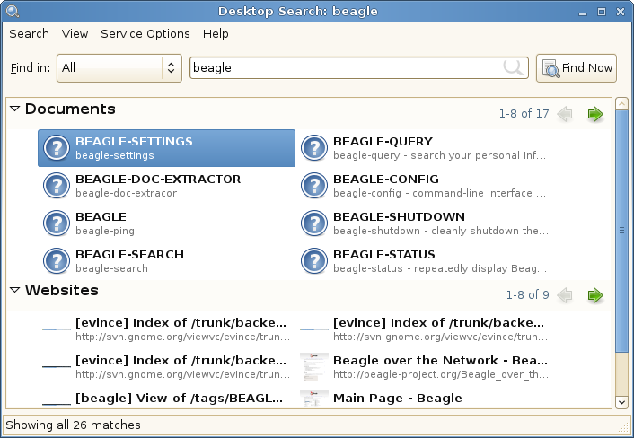 To use Beagle, click , enter your search terms in the field, then press Enter. The results are displayed in the Desktop Search dialog box.