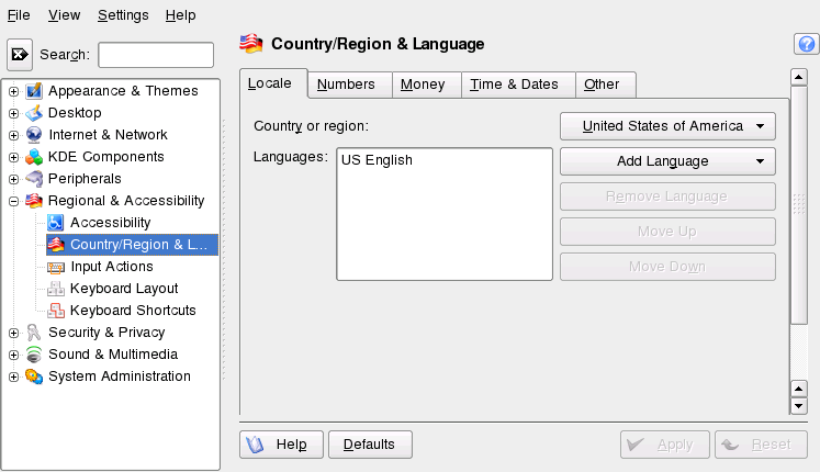 To adjust settings such as time and date format, number format, or currency, select the desired country as the default country in KDE. If more than one system language is installed on your computer, you can also select different languages in which KDE should show the graphical user interface and application interfaces.
