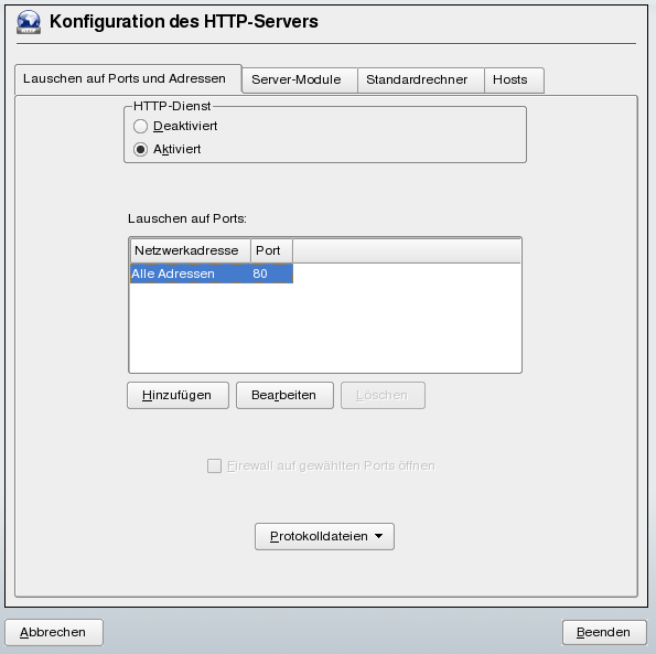 Geben Sie unter an, ob Apache laufen soll () oder beendet werden soll (). Mit den Schaltflächen , und geben Sie unter die Adressen und Ports an, die vom Server überwacht werden sollen. Standardmäßig werden alle Schnittstellen an Port 80 überwacht. Vergessen Sie nicht, das Kontrollkästchen zu aktivieren. Anderenfalls wäre der Webserver von außen nicht erreichbar. Das Schließen des Ports ist nur in Testsituationen sinnvoll, in denen kein externer Zugriff auf den Webserver erforderlich ist. Wenn Sie über mehrere Netzwerkschnittstellen verfügen, klicken Sie auf , um festzulegen, an welchen Schnittstellen die Ports geöffnet werden sollen.