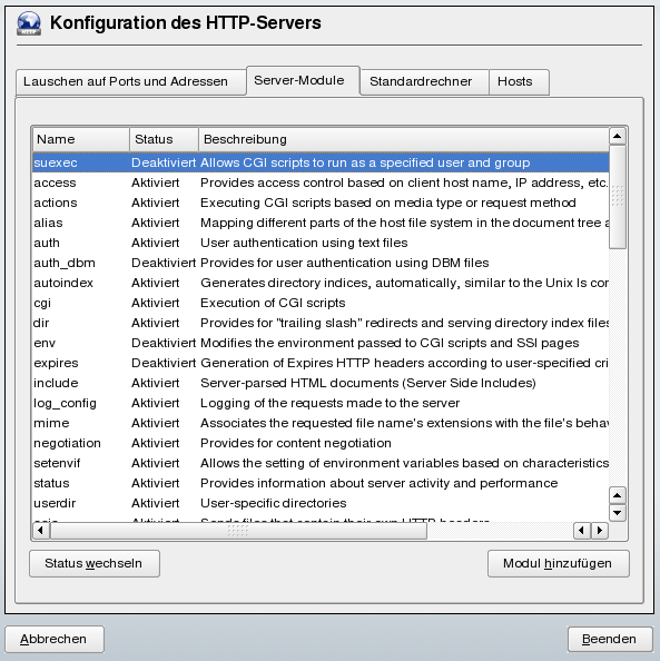 Über können Sie Apache2-Module aktivieren und deaktivieren. Über können Sie weitere Module hinzufügen, die zwar bereits installiert, aber noch nicht in dieser Liste aufgeführt sind. Weitere Informationen über Module finden Sie in Abschnitt 28.4, Installieren, Aktivieren und Konfigurieren von Modulen.