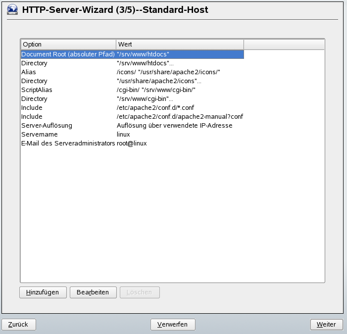 In diesem Schritt zeigt der Assistent eine Liste der bereits konfigurierten virtuellen Hosts an (siehe Virtuelle Hostkonfiguration). Wenn Sie vor dem Starten des YaST-HTTP-Assistenten keine manuellen Änderungen vorgenommen haben, ist kein virtueller Host vorhanden.