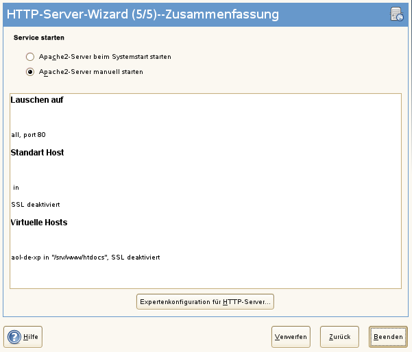 Dies ist der abschließende Schritt des Assistenten. Legen Sie hier fest, wie und wann der Apache-Server gestartet werden soll: beim Boot-Vorgang oder manuell. Außerdem erhalten Sie in diesem Schritt eine kurze Zusammenfassung Ihrer bisherigen Konfiguration. Wenn Sie mit den Einstellungen zufrieden sind, schließen Sie die Konfiguration mit ab. Möchten Sie Einstellungen ändern, dann klicken Sie so oft auf , bis das entsprechende Dialogfeld angezeigt wird. Über können Sie hier auch das in HTTP-Server-Konfiguration beschriebene Dialogfeld öffnen.