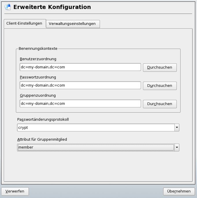 Verwenden Sie für die weitere Konfiguration der YaST-Gruppe und der Benutzerkonfigurationsmodule den YaST-LDAP-Client. Dies beinhaltet die Änderung der Standardeinstellungen für neue Benutzer und Gruppen und der Anzahl und Art von Attributen, die einem Benutzer bzw. einer Gruppe zugewiesen sind. Mit der LDAP-Benutzerverwaltung können Sie Benutzern und Gruppen mehrere und verschiedene Attribute zuweisen als bei herkömmlichen Lösungen zur Gruppen- oder Benutzerverwaltung. Die Konfiguration eines solchen Servers wird in Abschnitt 26.4.2, Konfigurieren der YaST-Gruppe und der Benutzerverwaltungsmodule beschrieben.