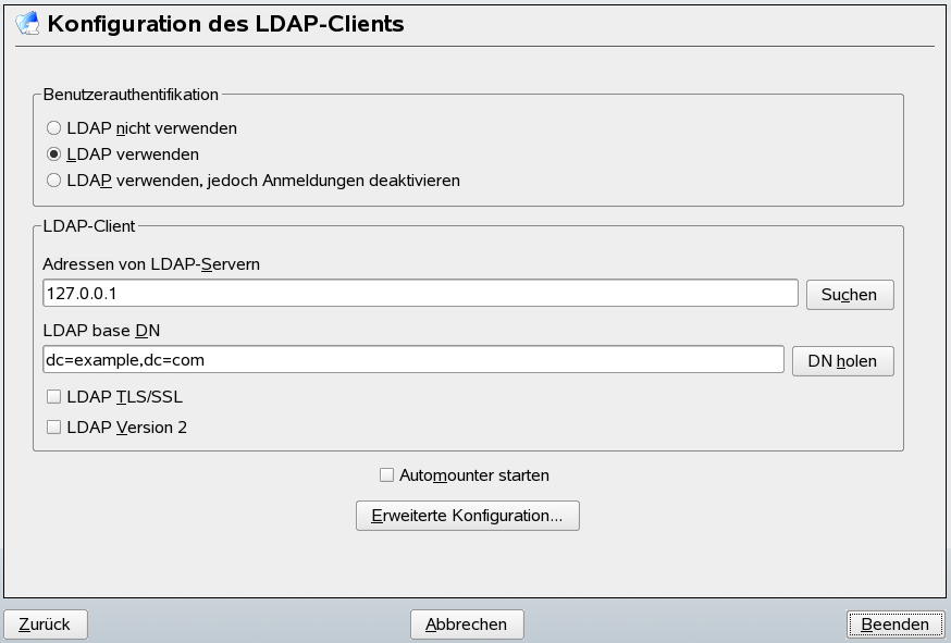 YaST enthält ein Modul zum Einrichten der LDAP-basierten Benutzerverwaltung. Wenn Sie diese Funktion bei der Installation nicht aktiviert haben, starten Sie das Modul, indem Sie wählen. YaST aktiviert alle PAM- und NSS-bezogenen Änderungen, die für LDAP erforderlich sind, und installiert die benötigten Dateien. Verbinden Sie einfach Client und Server miteinander und lassen Sie YaST Benutzer über LDAP verwalten. Das grundlegende Setup wird in Abschnitt 26.4.1, Konfigurieren der grundlegenden Einstellungen beschrieben.