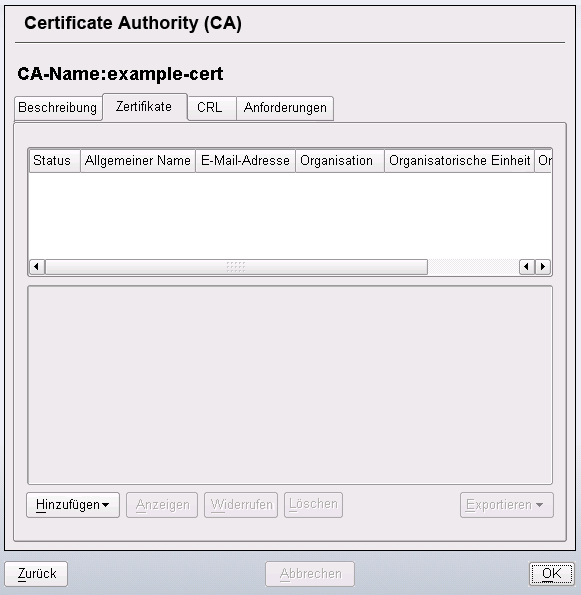 Klicken Sie auf . YaST zeigt zur Bestätigung die aktuellen Einstellungen an. Klicken Sie auf . Die Stammzertifizierungsstelle wird erstellt und anschließend in der Übersicht angezeigt.