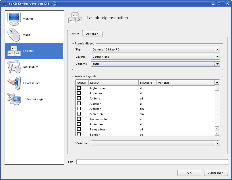 Durch Klicken auf die Schaltfläche wie in Schritt 7 beschrieben wird gleichzeitig das Layout der Konsolentastatur eingerichtet. Wenn das Layout der Konsolentastatur geändert werden soll, rufen Sie entweder yast keyboard (die Textmodus-Oberfläche) auf oder aktivieren Sie die Einstellungen für KEYTABLE und YAST_KEYBOARD unter /etc/sysconfig/keyboard.