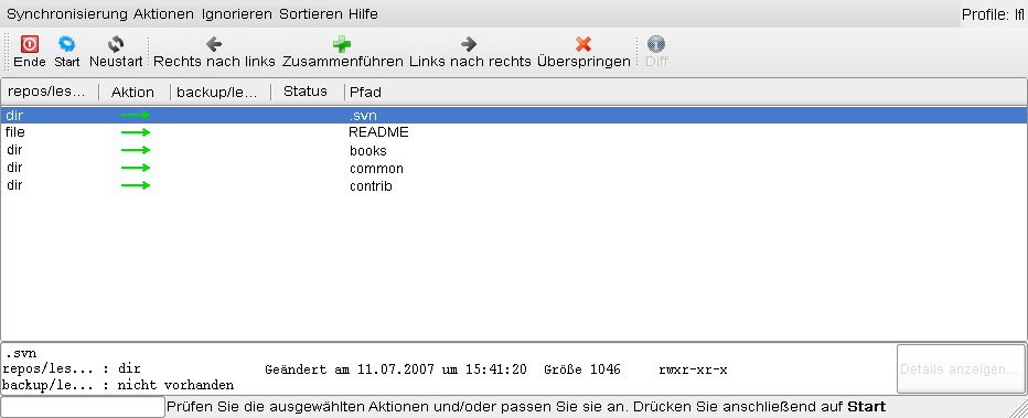In der linken Spalte wird das von Ihnen ausgewählte Quellverzeichnis angezeigt, in der dritten Spalte das Zielverzeichnis. Wenn die Verzeichnisse Unterschiede aufweisen, wird in der Spalte ein Symbol angezeigt und eine Aktion vorgeschlagen. Ein grüner Pfeil gibt an, dass eine Datei im Quell- oder Zielverzeichnis geändert, hinzugefügt oder gelöscht wurde. Die Richtung des Pfeils gibt die Richtung an, in die die Änderung propagiert werden würde, wenn Sie die Synchronisierungen zu diesem Zeitpunkt durchführen würden. Ein Fragezeichen gibt einen Konflikt an (beide Dateien wurden geändert und Unison kann nicht entscheiden, welche Datei überschrieben werden soll).