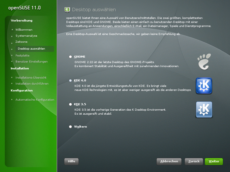 In openSUSE können Sie aus verschiedenen Desktops wählen (dieses Dialogfeld ist nicht verfügbar, wenn Sie die Installation von CD-KDE oder CD-GNOME durchführen). Die wichtigsten, und , sind leistungsfähige Desktop-Umgebungen, die Windows* ähneln. Weitere Informationen hierzu erhalten Sie im KDE User Guide,