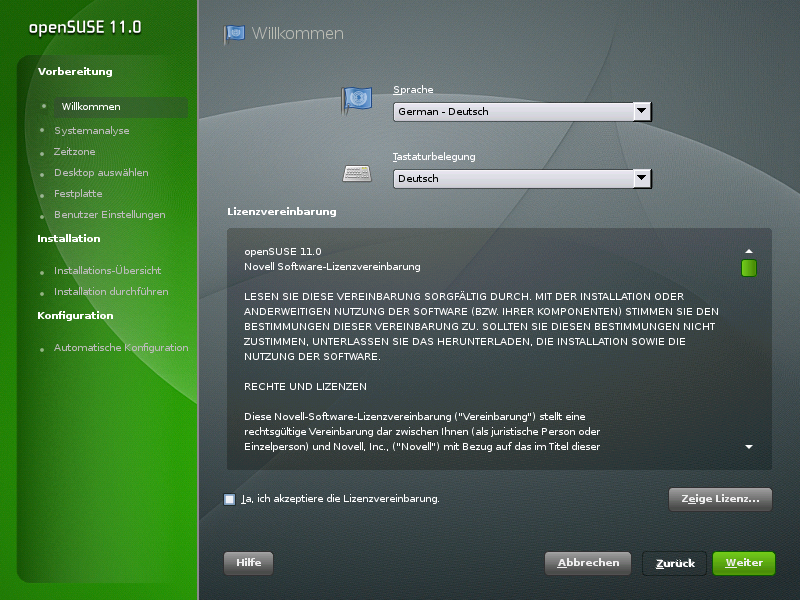 Lesen Sie sich die unter der Sprache und der Tastaturauswahl angezeigte Lizenzvereinbarung sorgfältig durch. Verwenden Sie , um die Lizenzvereinbarung im Vollbildmodus anzuzeigen, in dem Sie sie besser lesen und auf Übersetzungen zugreifen können. Wenn Sie mit den Bedingungen einverstanden sind, markieren Sie und klicken Sie auf , um mit der Installation fortzufahren. Wenn Sie die Lizenzvereinbarung nicht akzeptieren, können Sie openSUSE nicht installieren. Klicken Sie auf , um die Installation zu beenden.