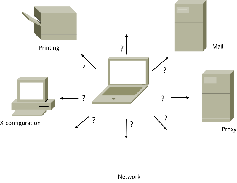 Ihr System muss sich an unterschiedliche Betriebsumgebungen anpassen können, wenn es für mobile Computernutzung verwendet werden soll. Viele Dienste hängen von der Umgebung ab und die zugrunde liegenden Clients müssen neu konfiguriert werden. openSUSE übernimmt diese Aufgabe für Sie.