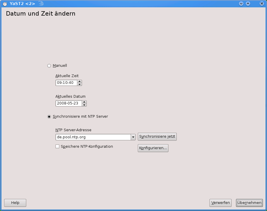 Mit der Schaltfläche können Sie auch die erweiterte NTP-Konfiguration öffnen. Weitere Informationen finden Sie in Abschnitt 24.1, Konfigurieren eines NTP-Client mit YaST,