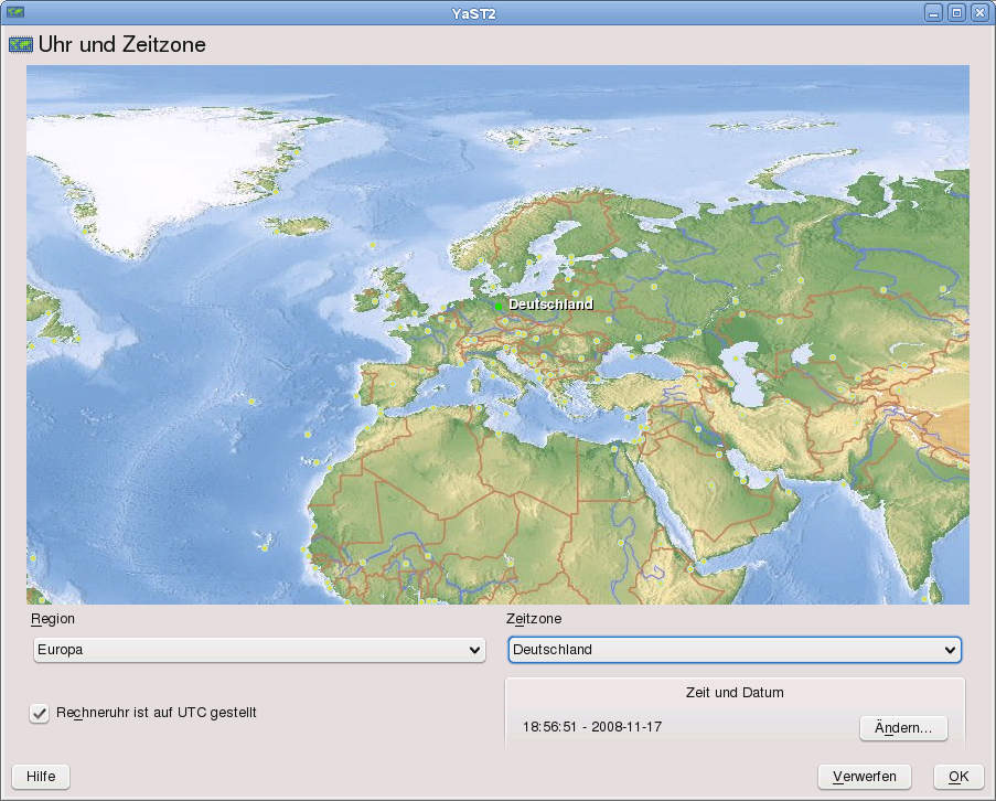 Passen Sie mithilfe des YaST-Moduls für Datum und Uhrzeit das Systemdatum sowie die Uhrzeit- und Zeitzoneninformationen an die Region an, in der Sie arbeiten. Wählen Sie zunächst eine allgemeine Region, beispielsweise . Wählen Sie die für Sie passende Zeitzone aus, beispielsweise .