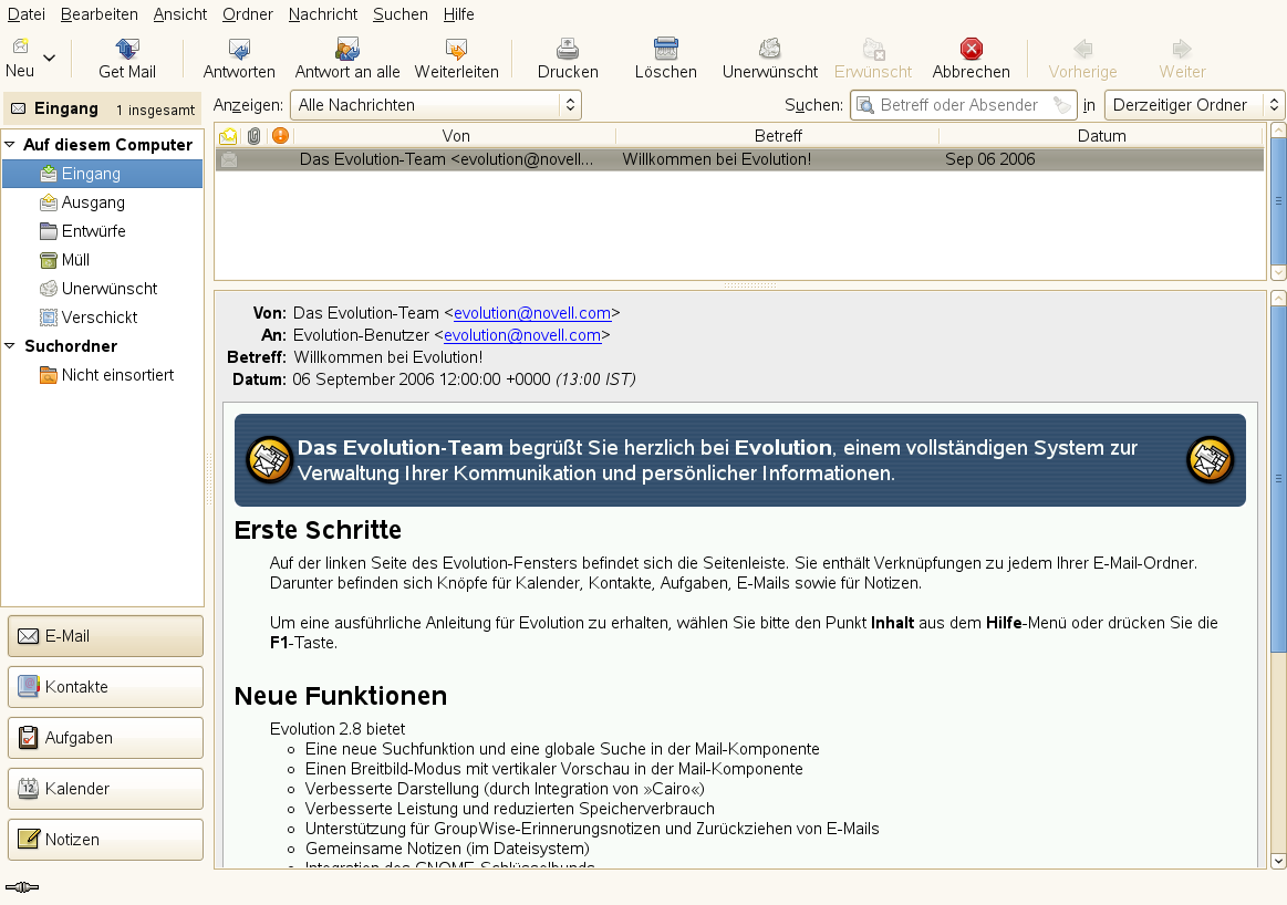 Evolution vereint die Funktionalität von E-Mail, Kalender, Adressbuch und Terminplaner in einer einzigen, einfach zu bedienenden Anwendung. Dank seiner umfassenden Unterstützung gängiger Kommunikations- und Datenaustauschstandards kann Evolution auch in bereits bestehenden Firmennetzwerken Seite an Seite mit vorhandenen Anwendungen wie Microsoft* Exchange eingesetzt werden.