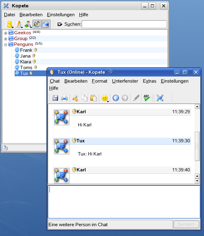 Kopete ist eine Online-Messenger-Anwendung, mit der mehrer Personen über das Internet miteinander chatten können. Kopete unterstützt derzeit alle bekannten Messenger-Protokolle, wie AOL* Instant Messenger (AIM), Gadu-Gadu, GroupWise® Messenger, ICQ, Jabber*, MSN, SMS und Yahoo!*. Um Instant Messaging (IM) verwenden zu können, müssen Sie sich beim einem Provider von IM-Diensten registrieren und ein Kopete-Konto konfigurieren.