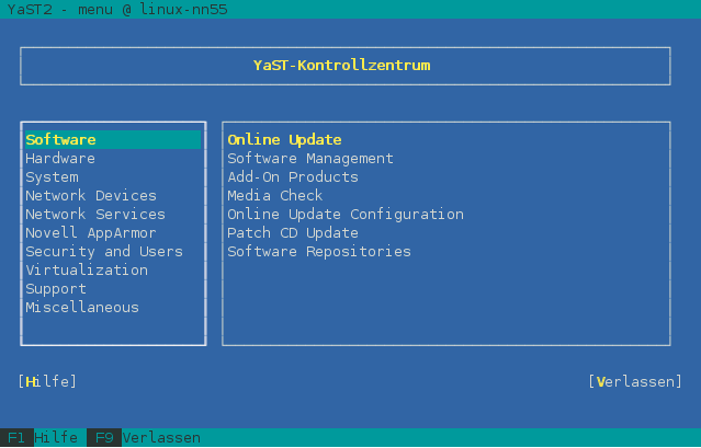 YaST verwendet im Textmodus die ncurses-Bibliothek, um eine bequeme pseudo-grafische Bedienoberfläche zu bieten. Die ncurses-Bibliothek wird standardmäßig installiert. Die minimale unterstützte Größe des Terminal-Emulators, in dem Sie YaST ausführen, beträgt 80x25 Zeichen.