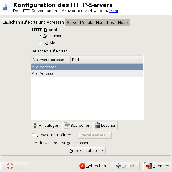 Um Ihren Webserver mit YaST zu konfigurieren, starten Sie YaST und wählen Sie . Wenn Sie dieses Modul zum ersten Mal starten, wird der HTTP-Server-Assistent geöffnet und sie werden aufgefordert, einige grundlegende Entscheidungen zur Verwaltung des Servers zu treffen. Nach Fertigstellung des Assistenten wird das unter HTTP-Server-Konfiguration beschriebene Dialogfeld geöffnet, sobald Sie das -Modul aufrufen.
