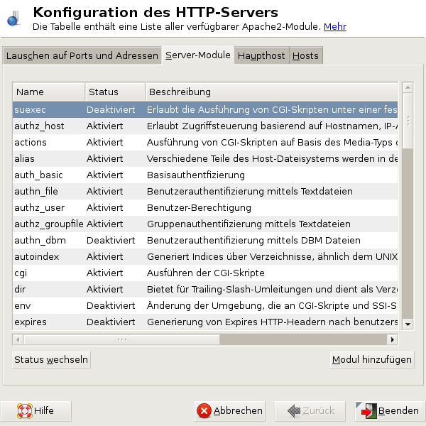 Über können Sie Apache2-Module aktivieren und deaktivieren. Über können Sie weitere Module hinzufügen, die zwar bereits installiert, aber noch nicht in dieser Liste aufgeführt sind. Weitere Informationen über Module finden Sie in Abschnitt 28.4, Installieren, Aktivieren und Konfigurieren von Modulen.