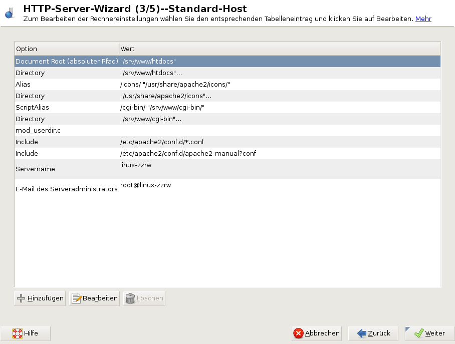 In diesem Schritt zeigt der Assistent eine Liste der bereits konfigurierten virtuellen Hosts an (siehe Virtuelle Hostkonfiguration). Wenn Sie vor dem Starten des YaST-HTTP-Assistenten keine manuellen Änderungen vorgenommen haben, ist kein virtueller Host vorhanden.