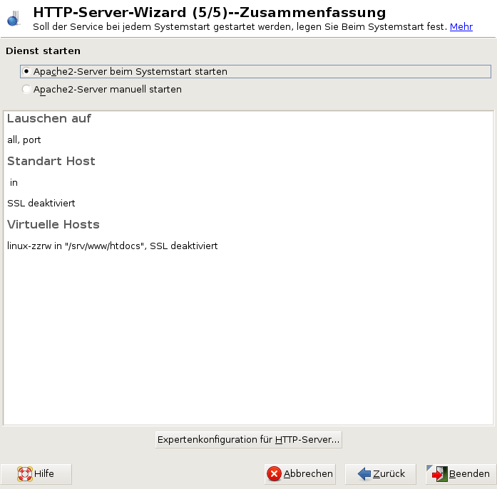 Dies ist der abschließende Schritt des Assistenten. Legen Sie hier fest, wie und wann der Apache-Server gestartet werden soll: beim Boot-Vorgang oder manuell. Außerdem erhalten Sie in diesem Schritt eine kurze Zusammenfassung Ihrer bisherigen Konfiguration. Wenn Sie mit den Einstellungen zufrieden sind, schließen Sie die Konfiguration mit ab. Möchten Sie Einstellungen ändern, dann klicken Sie so oft auf , bis das entsprechende Dialogfeld angezeigt wird. Über können Sie hier auch das in HTTP-Server-Konfiguration beschriebene Dialogfeld öffnen.