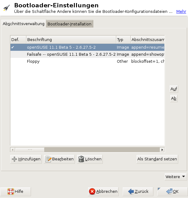Legen Sie den Bootloader-Typ unter fest. In openSUSE wird standardmäßig der Bootloader GRUB verwendet. Gehen Sie wie folgt vor, wenn Sie LILO verwenden möchten: