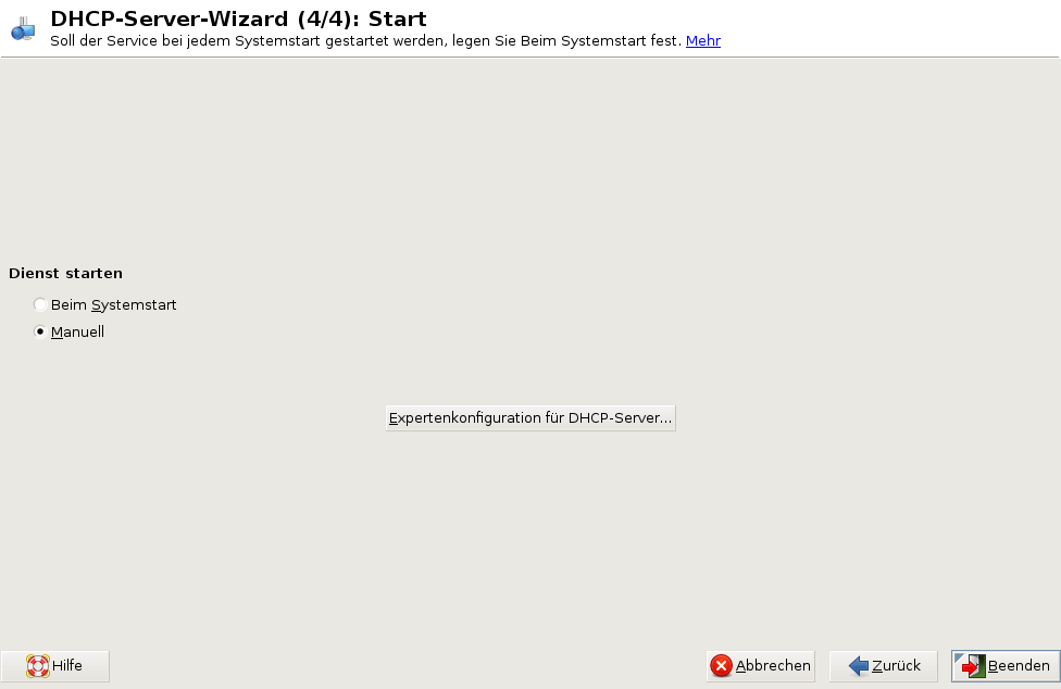 Nachdem Sie den dritten Teil des Konfigurationsassistenten abgeschlossen haben, gelangen Sie in ein letztes Dialogfeld, das sich mit den Startoptionen des DHCP-Servers befasst. Hier können Sie festlegen, ob der DHCP-Server automatisch beim Booten des Systems oder bei Bedarf (z. B. zu Testzwecken) manuell gestartet werden soll. Klicken Sie auf , um die Konfiguration des Servers abzuschließen. Weitere Informationen hierzu finden Sie unter Abbildung 24-4.