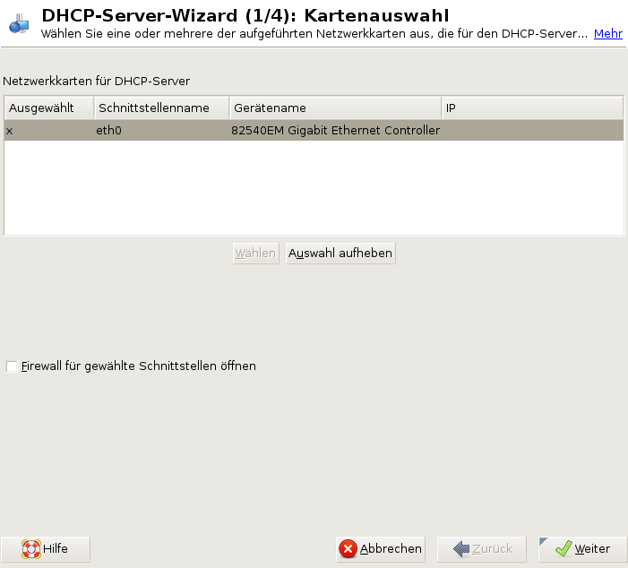 Im ersten Schritt ermittelt YaST die in Ihr System eingebundenen Netzwerkschnittstellen und zeigt sie anschließend in einer Liste an. Wählen Sie in dieser Liste die Schnittstelle aus, auf der der DHCP-Server lauschen soll, und klicken Sie auf . Wählen Sie anschließend die Option , um die Firewall für diese Schnittstelle zu öffnen. Weitere Informationen hierzu finden Sie unter Abbildung 24-1.