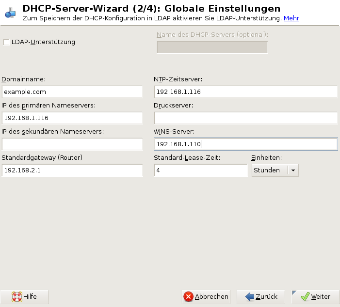 Geben Sie anhand des Kontrollkästchens an, ob Ihre DHCP-Einstellungen automatisch von einem LDAP-Server gespeichert werden sollen. In den Eingabefeldern legen Sie die Netzwerkinformationen fest, die jeder von diesem DHCP-Server verwaltete Client erhalten soll. Diese sind: Domänenname, Adresse eines Zeitservers, Adressen der primären und sekundären Namenserver, Adressen eines Druck- und WINS-Servers (für gemischte Netzwerkumgebungen mit Windows- und Linux-Clients), Gateway-Adressen und Leasing-Zeit. Weitere Informationen hierzu finden Sie unter Abbildung 24-2.