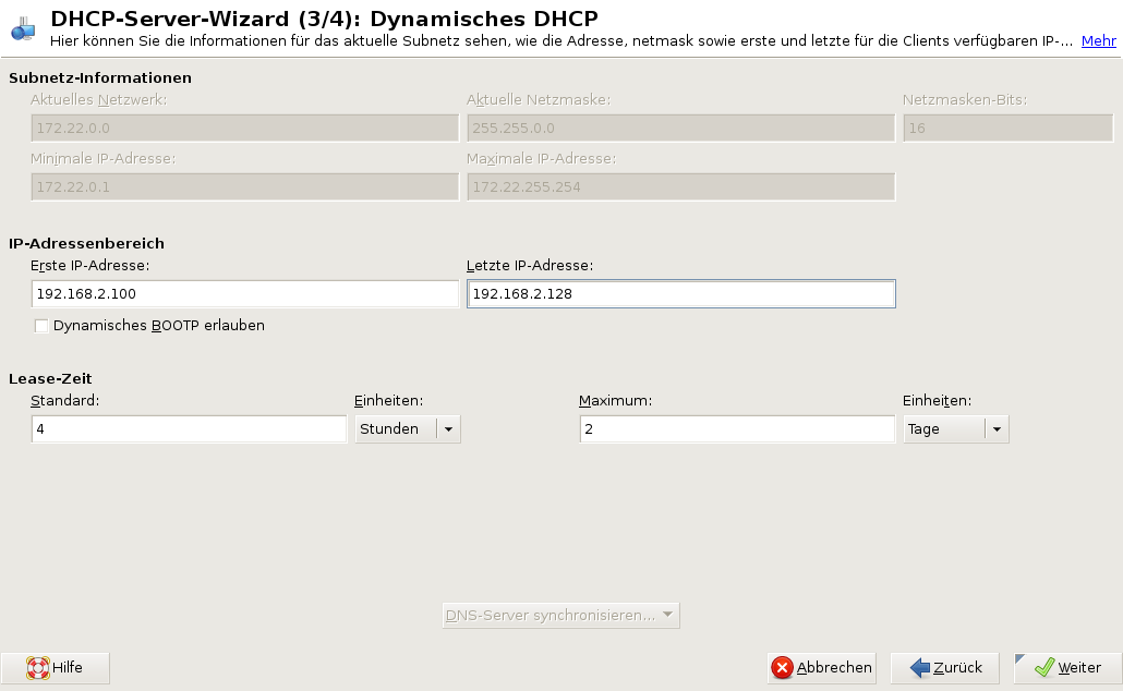 In diesem Schritt konfigurieren Sie die Vergabe der dynamischen IP-Adressen an Clients. Hierzu legen Sie einen Bereich von IP-Adressen fest, in dem die zu vergebenden Adressen der DHCP-Clients liegen dürfen. Alle zu vergebenden Adressen müssen unter eine gemeinsame Netzmaske fallen. Legen Sie abschließend die Leasing-Zeit fest, für die ein Client seine IP-Adresse behalten darf, ohne eine Verlängerung der Leasing-Zeit beantragen zu müssen. Legen Sie optional auch die maximale Leasing-Zeit fest, innerhalb derer eine bestimmte IP-Adresse auf dem Server für einen bestimmten Client reserviert bleibt. Weitere Informationen hierzu finden Sie unter Abbildung 24-3.