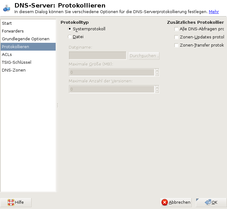 Um festzulegen, was und wie der DNS-Server protokollieren soll, wählen Sie aus. Geben Sie unter an, wohin der DNS-Server die Protokolldaten schreiben soll. Verwenden Sie die systemweite Protokolldatei /var/log/messages, indem Sie auswählen oder geben Sie eine andere Datei an, indem Sie auswählen. In letzterem Fall müssen Sie außerdem einen Namen, die maximale Dateigröße in Megabyte und die Anzahl der zu speichernden Versionen von Protokolldateien angeben.