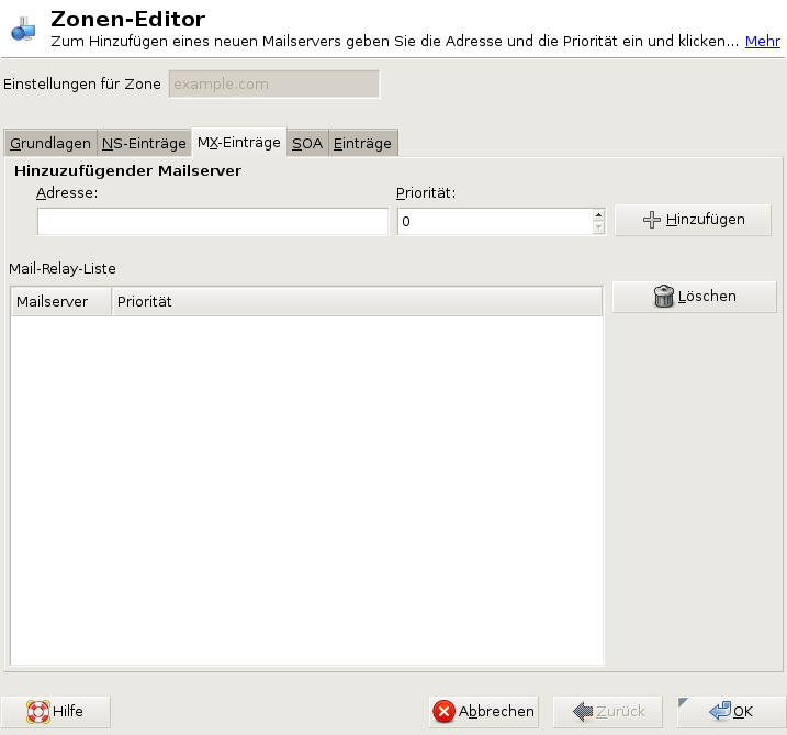 Um einen Mailserver für die aktuelle Zone zur bestehenden Liste hinzuzufügen, geben Sie die entsprechende Adresse und den entsprechenden Prioritätswert ein. Bestätigen Sie den Vorgang anschließend durch Auswahl von . Weitere Informationen hierzu finden Sie unter Abbildung 23-6.
