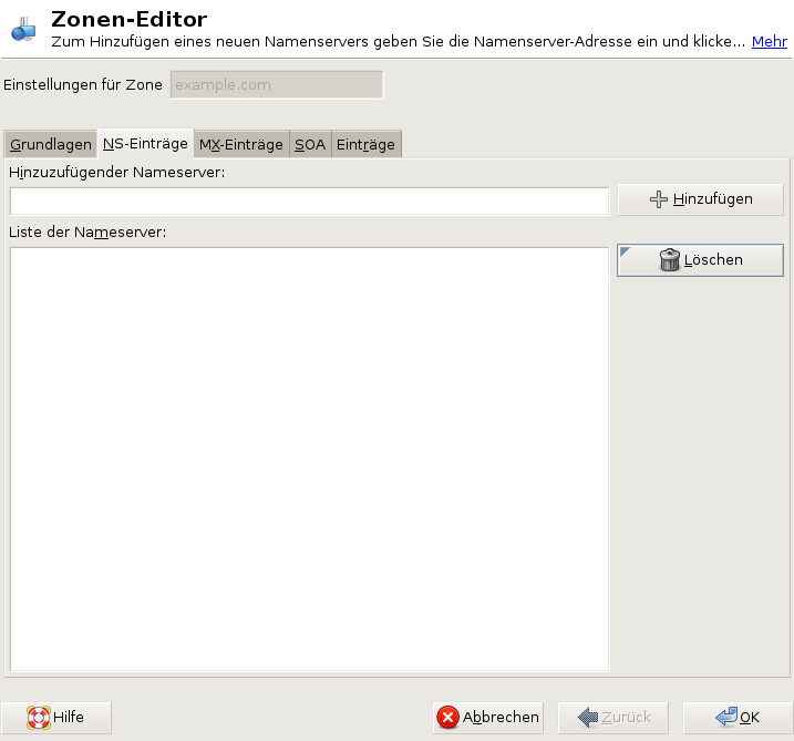 In diesem Dialogfeld können Sie alternative Namenserver für die angegebenen Zonen definieren. Vergewissern Sie sich, dass Ihr eigener Namenserver in der Liste enthalten ist. Um einen Eintrag hinzuzufügen, geben Sie seinen Namen unter ein und bestätigen Sie den Vorgang anschließend mit . Weitere Informationen hierzu finden Sie unter Abbildung 23-5.