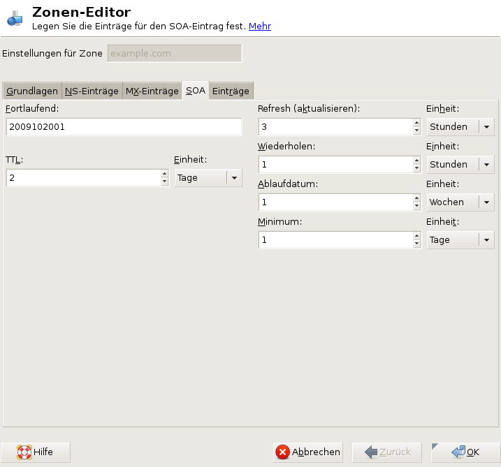 Auf dieser Seite können Sie SOA (Start of Authority)-Einträge erstellen. Eine Erklärung der einzelnen Optionen finden Sie in Beispiel 23-6.