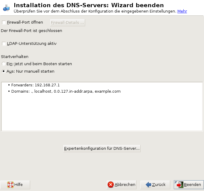 Im letzten Dialogfeld können Sie den DNS-Port in der Firewall öffnen, indem Sie auf klicken. Legen Sie dann fest, ob der DNS-Server gestartet werden soll ( oder ). Außerdem können Sie die LDAP-Unterstützung aktivieren. Weitere Informationen hierzu finden Sie unter Abbildung 23-3.