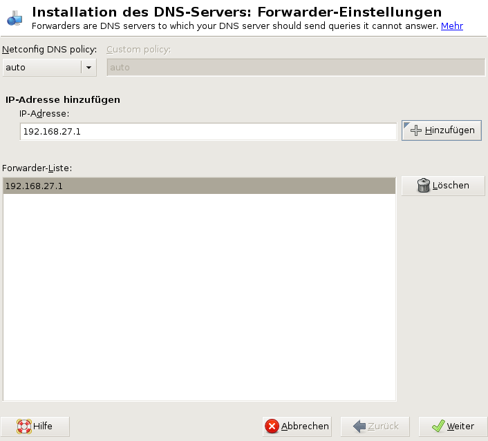 Falls Ihr lokaler DNS-Server eine Anforderung nicht beantworten kann, versucht er, diese Anforderung an einen weiterzuleiten, falls dies so konfiguriert wurde. Dieser Forwarder kann manuell zur hinzugefügt werden. Wenn der Forwarder nicht wie bei Einwahlverbindungen statisch ist, wird die Konfiguration von verarbeitet. Weitere Informationen über netconfig finden Sie auf man 8 netconfig.