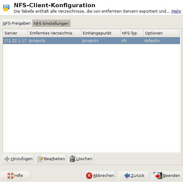 Autorisierte Benutzer können NFS-Verzeichnisse von NFS-Servern in ihre eigenen Dateibäume einhängen. Dies geschieht mit dem YaST-Modul . Klicken Sie auf und geben Sie nur den Hostnamen des NFS-Servers, das zu importierende Verzeichnis und den Einhängepunkt an, an dem das Verzeichnis lokal eingehängt werden soll. Die Änderungen werden wirksam, nachdem im ersten Dialogfeld auf geklickt wird.