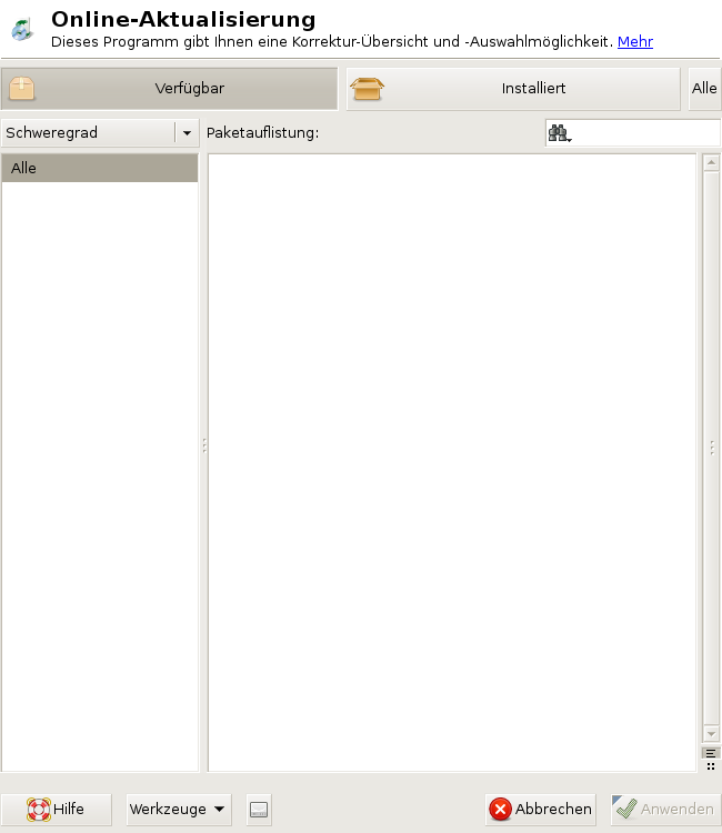 Das Fenster ist in zwei Hauptabschnitte unterteilt. Im linken Fensterbereich werden alle Patches aufgelistet sowie verschiedene Filter für die Patch-Liste zur Verfügung gestellt. Im rechten Fensterbereich finden Sie eine Liste der Änderungen, die ausgeführt werden, sobald Sie auf klicken.