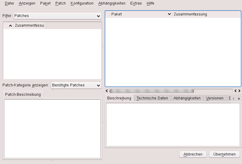 Das Fenster ist in vier Abschnitte unterteilt. Die Liste aller verfügbaren Patches wird links angezeigt. Unter der Liste der Patches sehen Sie die Beschreibung des ausgewählten Patches. Die rechte Spalte listet die Pakete auf, die im ausgewählten Patch inbegriffen sind. (Ein Patch kann mehrere Pakete umfassen.) Darunter wird eine ausführliche Beschreibung des ausgewählten Pakets angezeigt.