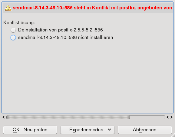 Sofern Sie nicht sehr erfahren sind, folgen Sie den Vorschlägen von YaST bei der Behandlung von Paketkonflikten, ansonsten sind Sie eventuell nicht in der Lage, die Konflikte zu lösen. Bedenken Sie, dass jede Änderung, die Sie vornehmen, andere Konflikte verursachen kann, d. h. Sie können ganz schnell einer stetig wachsenden Anzahl an Konflikten gegenüberstehen. Halten Sie in einem solchen Fall die Softwareverwaltung über an, heben Sie alle Ihre Änderungen mit der Option auf und beginnen Sie noch einmal von vorne.