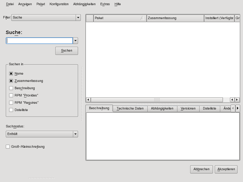 Die Oberfläche für die Paketsuche ist die Standardansicht der Softwareverwaltung. Geben Sie einen Suchbegriff ein und drücken Sie Enter. Verfeinern Sie Ihre Suche, indem Sie einen Suchort in angeben und den ändern.
