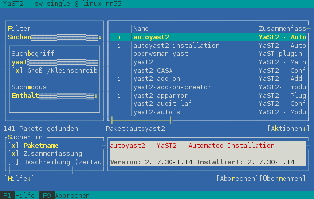 Die F-Tasten (F1 bis F12) bieten schnellen Zugriff auf die verschiedenen Schaltflächen. Verfügbare F-Tastenkürzel werden in der untersten Zeile des YaST-Bildschirms angezeigt. Welche Funktionstasten welchen Schaltflächen zugeordnet sind, hängt vom aktiven YaST-Modul ab, da die verschiedenen Module unterschiedliche Schaltflächen aufweisen ("Details", "Info", "Hinzufügen", "Löschen" usw.). F10 wird für Übernehmen, OK, Weiter und Beenden verwendet. Drücken Sie F1, um Zugriff auf die YaST-Hilfe zu erhalten.