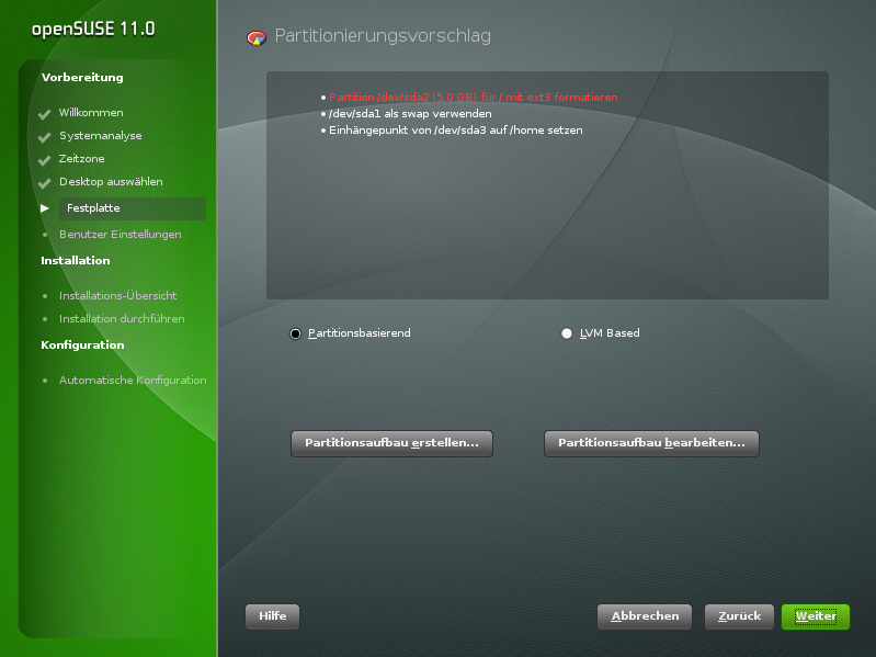 Wenn Ihr Rechner mehr als eine Festplatte beinhaltet und Sie den Partitionierungsvorschlag auf nur eine Festplatte beschränken möchten, wählen Sie (Partitionseinrichtung erstellen) und wählen Sie dann eine bestimmte Festplatte aus der Liste aus. Wenn die ausgewählte Festplatte noch keine Partitionen enthält, so wird dennoch die gesamte Festplatte für den Vorschlag verwendet. Andernfalls können Sie wählen, welche vorhandenen Partitionen verwendet werden sollen. Um eine getrennte Partition für Ihre persönliche Datenüberprüfung hinzuzufügen, aktivieren Sie (Getrennte Home-Partition vorschlagen). Anstelle des auf der Standardpartition basierenden Vorschlags können Sie auch einen . Klicken Sie zwei Mal auf , um mit dem nächsten Schritt fortzufahren.