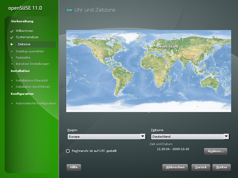 In diesem Dialogfeld können Sie Ihre Region und Zeitzone wählen. Beide Werte werden entsprechend der ausgewählten Installationssprache festgelegt. Um die festgelegten Werte zu ändern, verwenden Sie entweder die Landkarte oder die Dropdown-Listen für die und die . Wenn Sie die Landkarte verwenden, zeigen Sie mit dem Cursor in die ungefähre Richtung Ihrer Region und betätigen Sie die linke Maustaste, um zu zoomen. Wählen Sie nun Ihr Land oder Ihre Region, indem Sie die linke Maustaste betätigen. Betätigen Sie die rechte Maustaste, um zur Weltkarte zurückzukehren.
