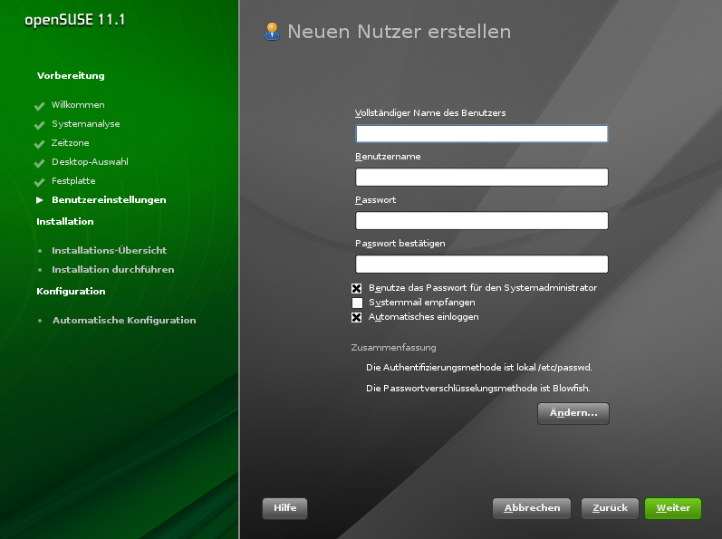 Sie können auch zusätzliche Benutzerkonten hinzufügen oder die Benutzerauthentifzierungsmethode im installierten System ändern. Ausführliche Informationen zur Benutzerverwaltung finden Sie unter Abschnitt 8.0, Verwalten von Benutzern mit YaST,
