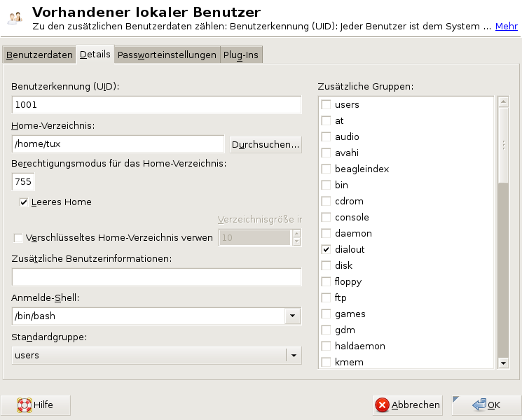Abbildung 6-1 Gruppenmitgliedschaft für einen Benutzer in YaST
